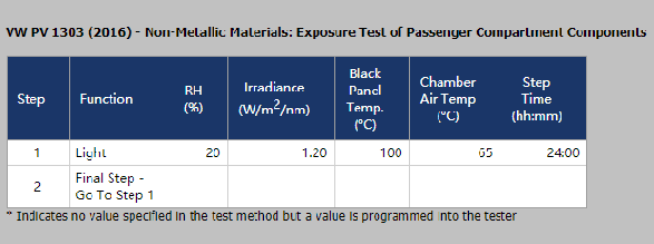 PV1303非金屬材料汽車內(nèi)部空間里結(jié)構(gòu)件光照射試驗(yàn) 中氙燈老化測(cè)試的循環(huán)參數(shù)設(shè)置如下: