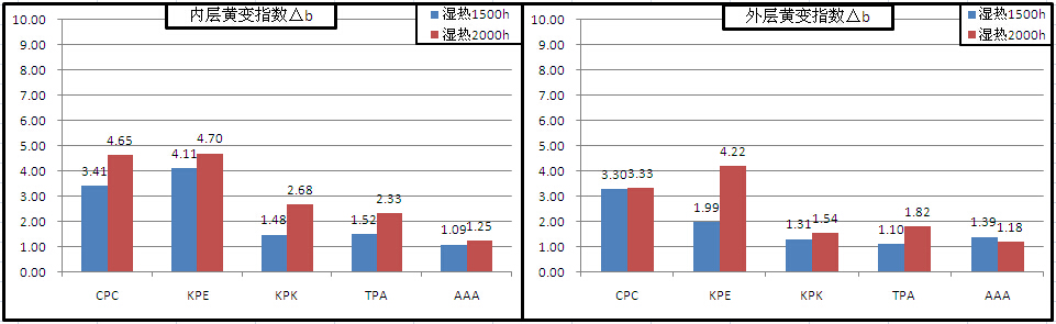 濕熱老化(85度,85%濕度):在濕熱1500h后,涂覆型背板的內(nèi)層和外層,以及KPE背板的內(nèi)層E層,即已發(fā)生不同程度的黃變(如圖1)。至濕熱2000h時,多數(shù)背板的內(nèi)層及外層黃變程度均有加深,尤其是涂覆型背板的內(nèi)層,以及KPE背板內(nèi)層E層。TPA背板的內(nèi)層A層及AAA背板內(nèi)外層在濕熱老化過程中有輕微黃變(不明顯);個別PVDF膜表現(xiàn)較差,如試驗中的背板KPE的外層PVDF,在濕熱老化至2000h時,也發(fā)生了明顯黃變;而特能® (Tedlar®)膜,在濕熱老化過程中無明顯黃變現(xiàn)象??傮w而言,濕熱老化過程中,涂覆型背板的涂層(尤其是內(nèi)層涂層)較氟膜PVDF膜和特能® (Tedlar®)膜,以及AAA(聚酰胺)更容易發(fā)生黃變。