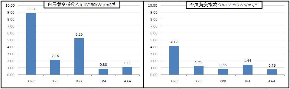 UV150kWh/m2(60℃-試驗箱內(nèi)空氣溫度,輻照度45W/m2):UV試驗時,背板外層對著紫外燈。在UV150kWh/m2后(圖2),涂覆型背板的內(nèi)層和外層均發(fā)生了顯著黃變;個別PVDF膜,如試驗的KPK背板的內(nèi)層PVDF層,也發(fā)生了顯著黃變;而特能® (Tedlar®)膜和較好的PVDF膜,無明顯黃變;KPE內(nèi)層E層及AAA背板,也無明顯黃變。之所以背板外層對著紫外燈,而背板內(nèi)層仍然發(fā)生黃變,是由于試驗箱中,紫外燈燈管沿箱子一側(cè)的箱壁從上之下依次裝配,背板材料只能也采取外層面向紫外燈管從上至下依次懸掛放置,而背板另一側(cè)的箱壁(不銹鋼制作)會不可避免反射紫外線至背板的內(nèi)層,如此造成背板內(nèi)層黃變現(xiàn)象的發(fā)生。總體而言,加強UV輻照下,涂覆型背板的涂層和一些PVDF膜,容易發(fā)生黃變,特能® (Tedlar®)膜則表現(xiàn)較好。