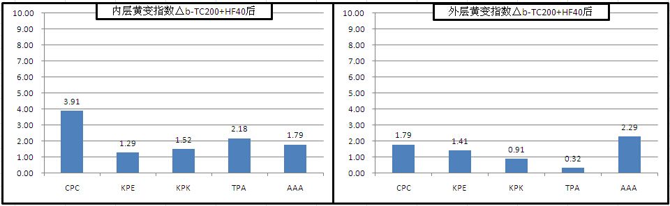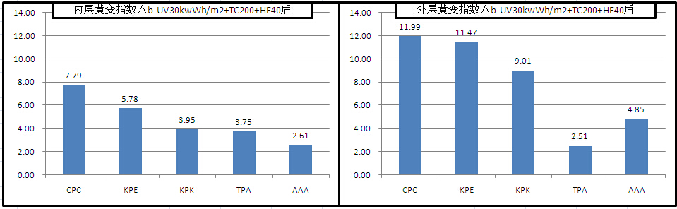 TC200+HF40:經(jīng)過TC200+HF40擴展序列測試后(圖3),涂覆型背板的內(nèi)層發(fā)生了比較明顯的黃變,而外層涂層黃變程度相對較輕,但△b仍接近2;復合型背板,無論是氟膜PVDF或特能® (Tedlar®),還是內(nèi)層E層,均無明顯黃變;而TPA的A層,以及AAA的外層,均發(fā)生了輕微的黃變(不明顯)。總體而言,擴展的高低溫序列測試,只有涂覆型背板的內(nèi)涂層發(fā)生了一定程度的黃變。