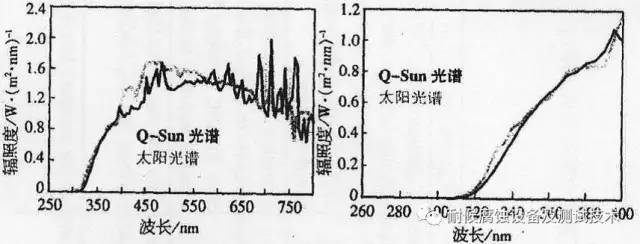 氙燈產(chǎn)生的光譜用于測試前必須經(jīng)過過濾,減少不需要的部分紫外光譜。使用不同類型的玻璃濾光器可以得到不同的光譜。濾光器的使用取決于被測材料和產(chǎn)品最終使用條件。不同的過濾器過濾的紫外線的短波段的截止點不同,這將在很大程度上影響老化的速度和類型。有三類經(jīng)常使用的濾光器:日光過濾器,窗玻璃過濾器,紫外延展過濾器。在紡織品測試中一般選擇窗玻璃過濾器,下圖1所示是Q-Lab公司配備有過濾器的Q-Sun氙燈日曬機的光譜與透過玻璃的太陽光光譜之間的比較。